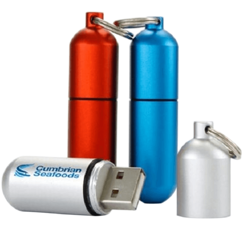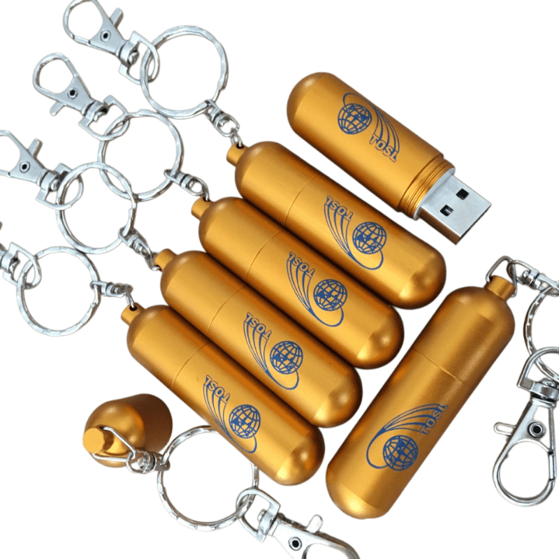 The minimum order quantity for the cylindrical USB drive is 100 units. Crafted from aluminum metal, it includes a small keyring attachment, making it ideal for carrying on your keys. Available storage capacities start at 2GB and extend up to 128GB. For further details on this model, please contact us.