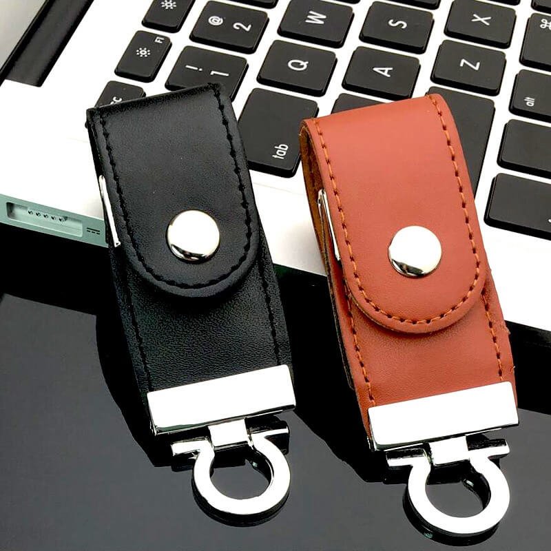 The flip-top metal clasp leather USB drive features a closed clasp design with a leather exterior and premium metal snap closure. Simply flip open to use, replacing traditional magnetic designs with a hidden metal clasp. Combining sturdy metal rings with exquisite leather, its distinctive style makes it one of the most popular leather-case USB drive models in recent years.
