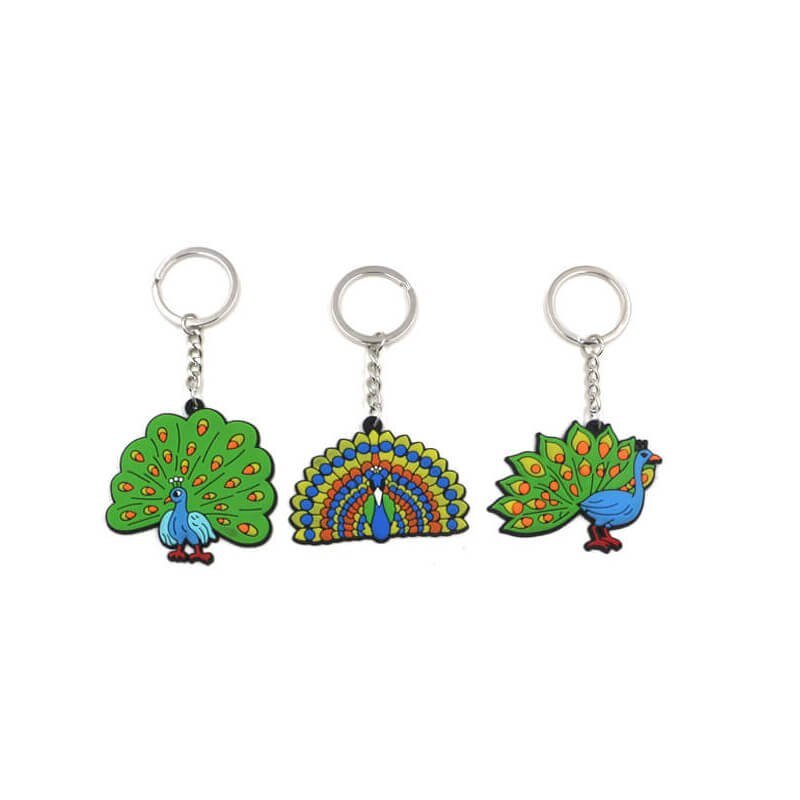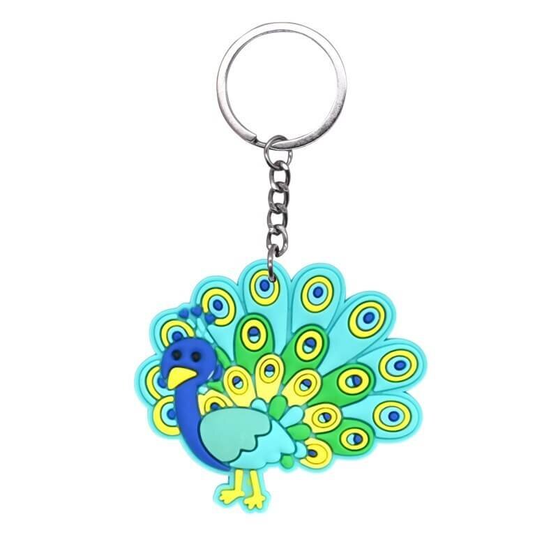 El llavero pavo real tiene un cuerpo de PVC blando con una textura flexible y elástica. Sus vibrantes colores presentan una gran saturación y resistencia a la decoloración, mientras que el diseño tridimensional da vida a la expresión de cada pavo real y a sus intrincados detalles. Tanto el llavero como la cadena están fabricados en aleación de zinc, tratada con galvanoplastia para una mayor durabilidad a prueba de óxido. Estos llaveros son muy apreciados por sus vibrantes colores y su exquisita artesanía, lo que los convierte en uno de los artículos más vendidos en tiendas culturales y creativas.
