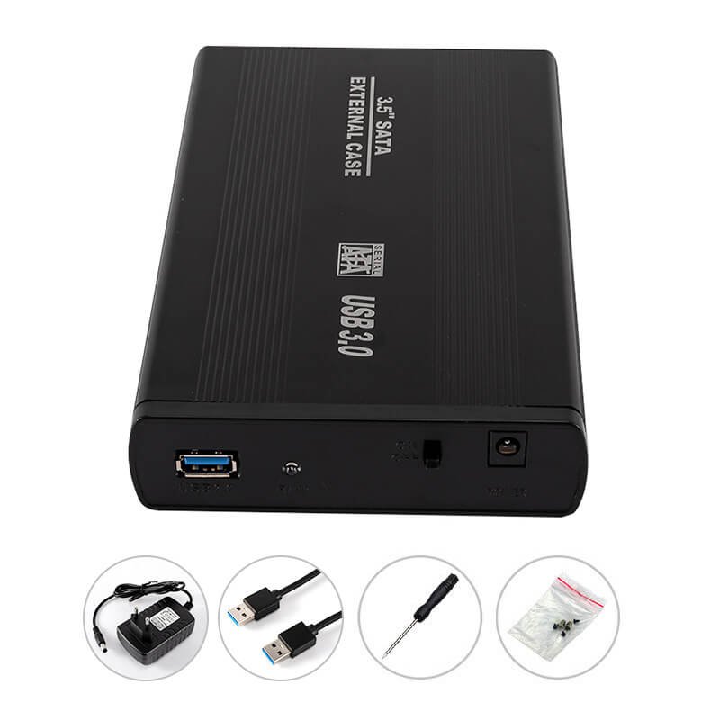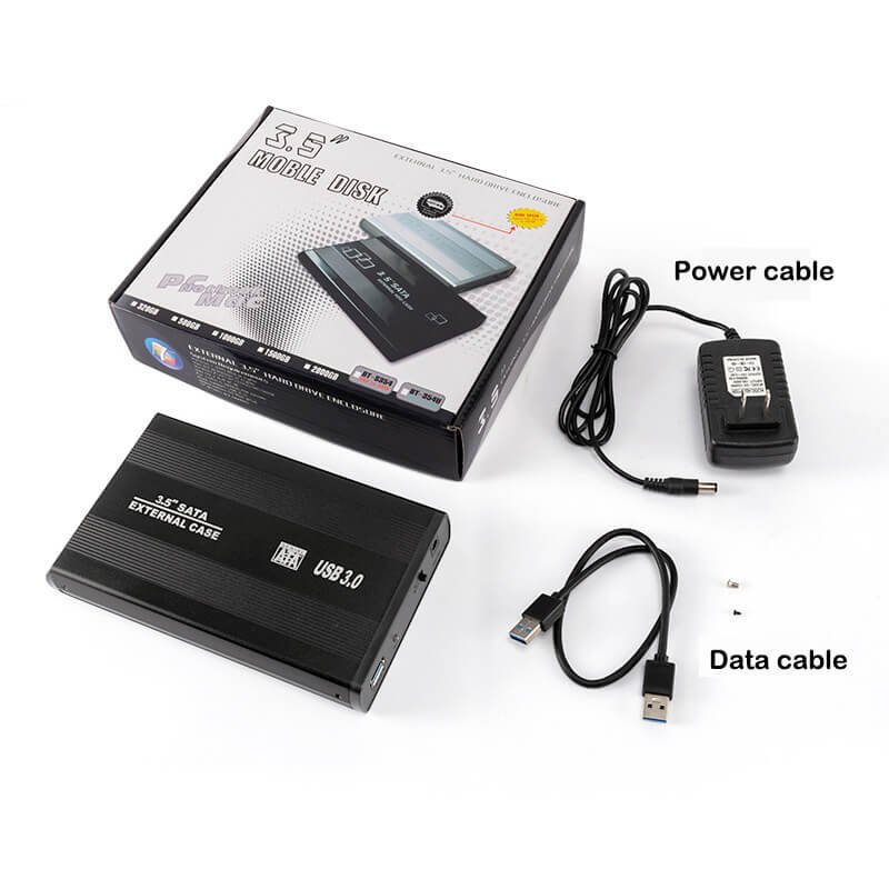 Core compatibility with 3.5-inch SATA desktop hard drives (supporting both HDD and SSD). Features a DC power input port (providing independent power for 3.5-inch drives). Includes power cable, data cable, installation tools, and accessories for straightforward setup.