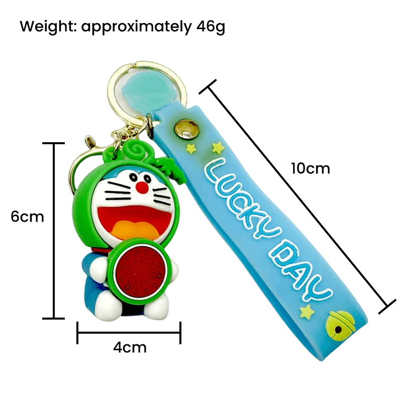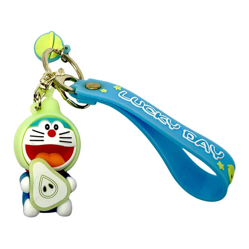 Este llavero Doraemon sandía tiene un cuerpo principal verde.Doraemon está sosteniendo una sandía, creando una apariencia muy mona.La muñequera de PVC viene en azul clásico y admite la impresión de logotipos personalizados. Además, puede elegir su color favorito para la personalización.