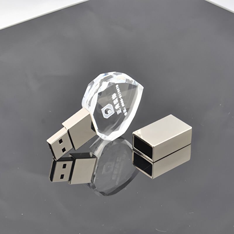 This USB drive supports logo customization through laser engraving on either the crystal body or cap. The engraved designs are crisp, wear-resistant, and long-lasting.