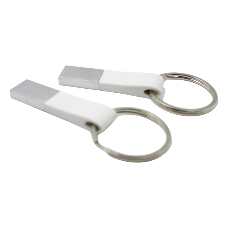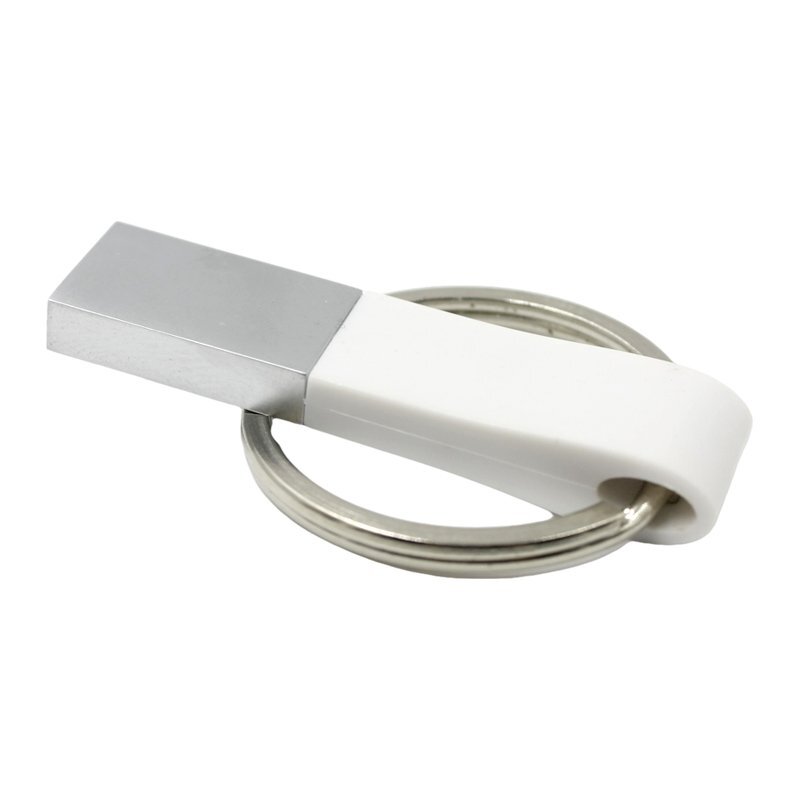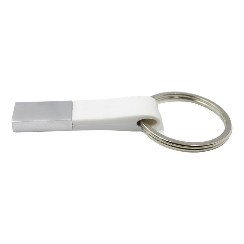 Esta unidad flash USB blanca para llavero presenta un diseño integrado que combina un cuerpo rectangular con un componente curvado para llavero.