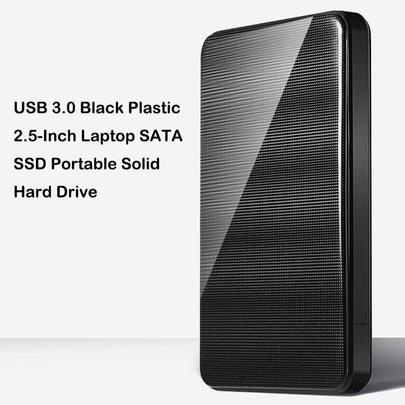 Ce produit est un disque dur portable SSD USB 3.0 en plastique noir de 2,5 pouces.
