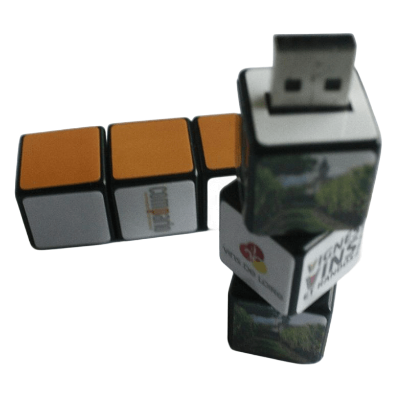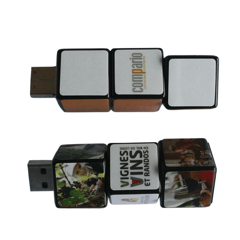Cette clé USB présente un design modulaire rotatif unique qui se transforme d'un cube compact en une fine bande rectangulaire pour la connexion USB, puis se replie en un cube pour un rangement facile lorsqu'elle n'est pas utilisée.