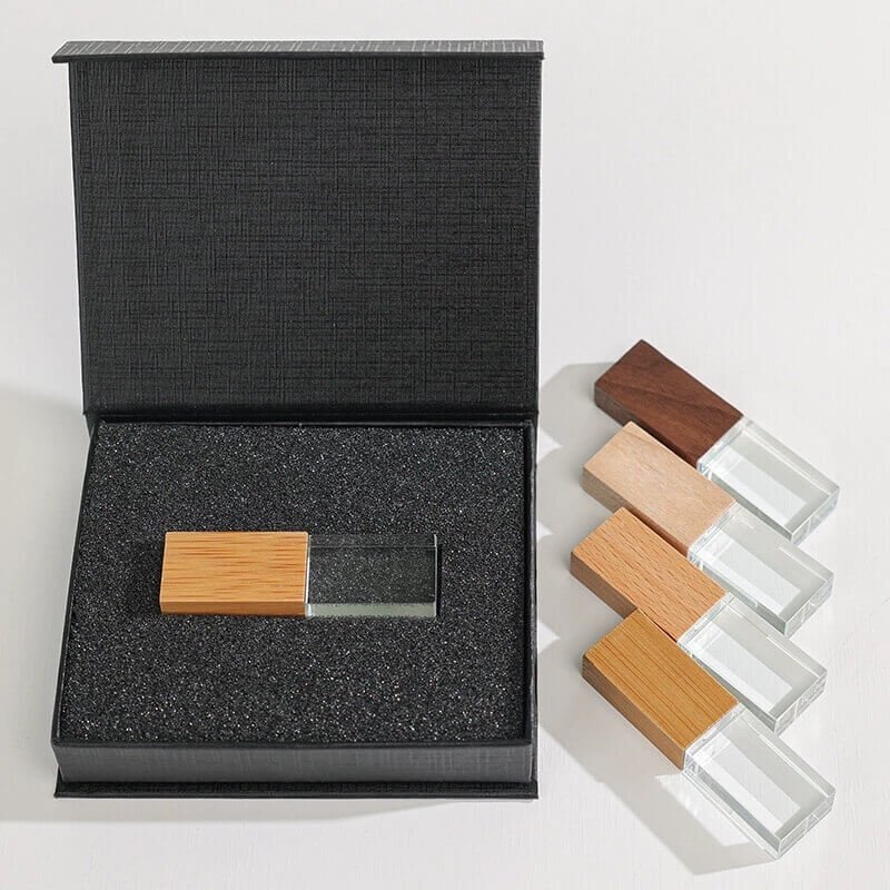 La clé USB Wooden Crystal combine un capuchon en bois massif naturel avec un corps en cristal à haute transparence, offrant une expérience chaleureuse avec une fonctionnalité pratique.