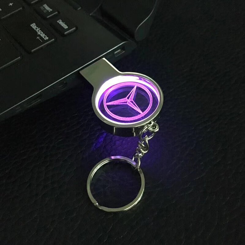 Il cristallo circolare funge da superficie di emissione della luce (diametro 20-25 mm), mentre la parte metallica rettangolare sottostante collega l'interfaccia USB e il portachiavi. Le forme geometriche sovrapposte creano una gerarchia visiva "2D→3D".