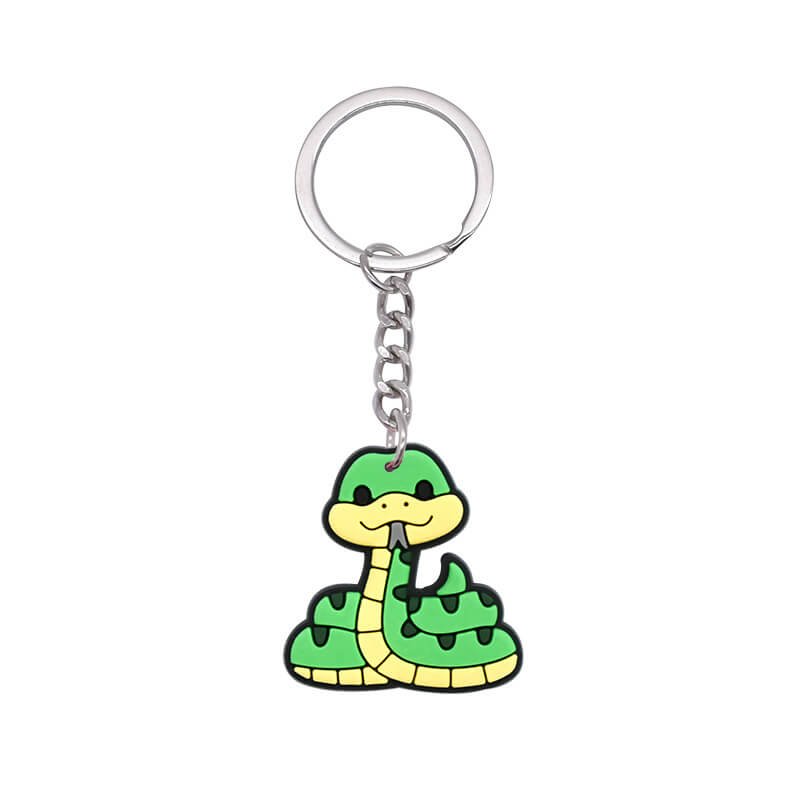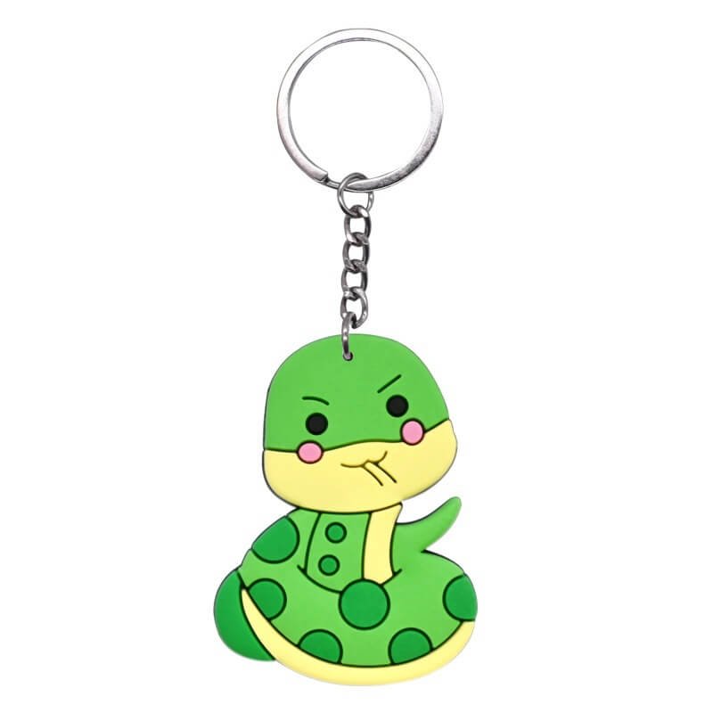 3.This snake keychain features a body coiled in shades of green with circular spots, accented by rosy cheeks and slightly furrowed brows. It resembles a slightly temperamental yet utterly adorable “snake baby,” with its expressive details lending it a distinct personality.