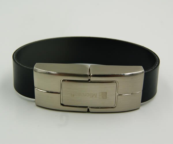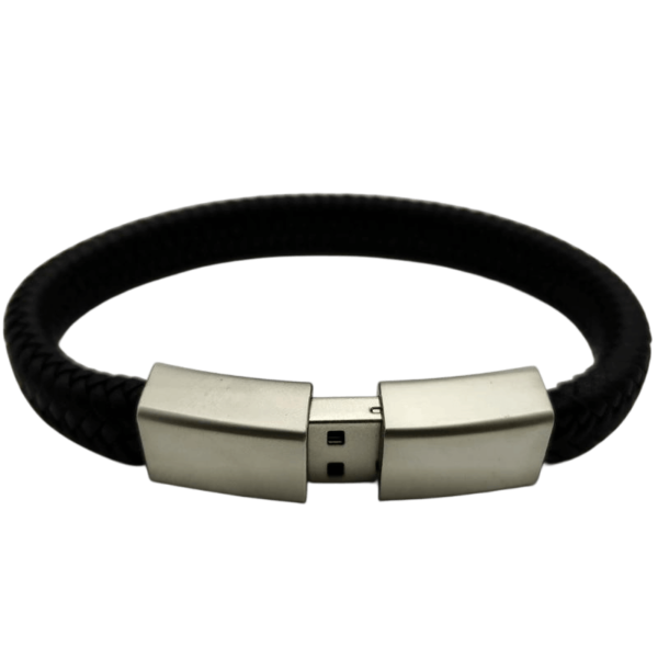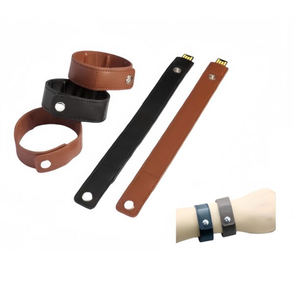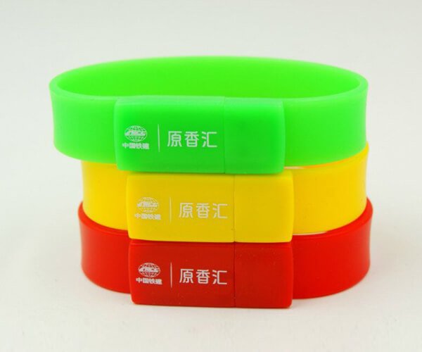 Common materials for wristband USB drives include PVC soft rubber and silicone, with some also using leather + metal or fabric.