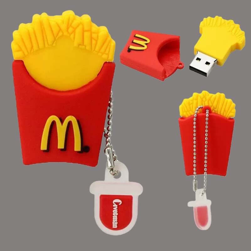 They come in various capacities (8GB, 16GB, 64GB, etc.) and materials (like PVC or silicone), serving as memorable marketing tools for food businesses or just as quirky personal accessories.