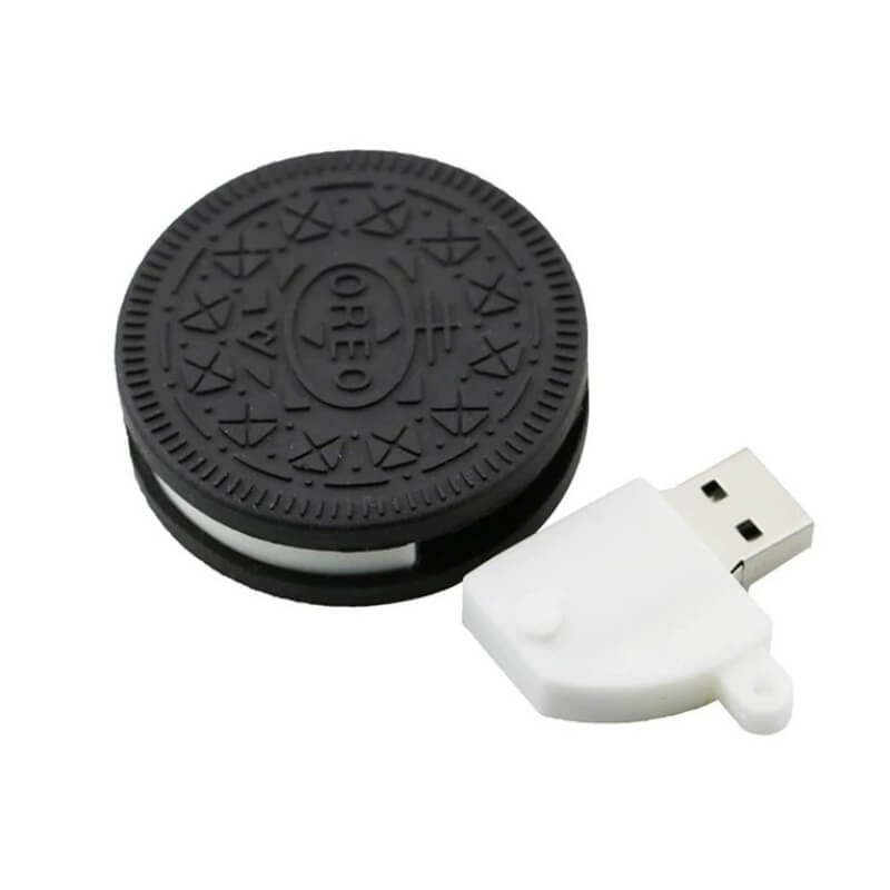 The Oreo cookie USB drive features a jet-black cookie shell engraved with the iconic Oreo pattern and “OREO” lettering. The intricate details even capture the serrated edges of the cookie, making it look just like a real Oreo. The outer cookie shell serves as a protective cap, concealing the white USB drive body beneath. Inserting or removing the drive mimics separating an Oreo cookie. The striking black-and-white color contrast instantly evokes familiar food memories, lending this tech gadget a snack-like charm.