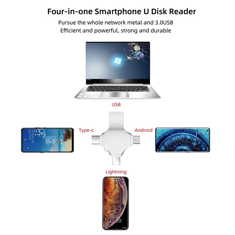 This four-in-one OTG USB flash drive features a “four-in-one interface integration” design, combining Lightning (for Apple devices), Micro USB (for traditional Android devices), USB (for computers), and Type-C (for the latest devices) in a compact design. It’s like a mini “interface hub” that can easily adapt to different devices.