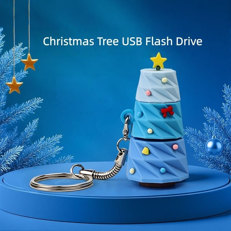 Featuring a layered stacked Christmas tree design, it is topped with a star ornament and adorned with colorful accessories, faithfully recreating the details of Christmas decorations. The structure is detachable, with the USB drive body concealed within the layered modules. It also comes with a metal keyring for convenient portability.