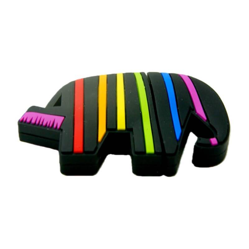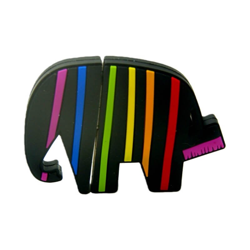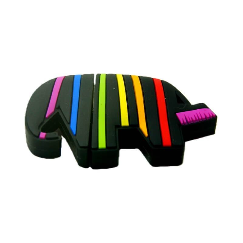 This USB flash drive is shaped like an elephant, and its kind of cartoonish with a rainbow theme. Its made from soft PVC material, which feels high quality I suppose. The base is black, and there are these vibrant rainbow stripes going vertically, so it really stands out from regular drives. The design splits, where the trunk, which has pink details, covers the USB connector like a cap. That seems practical. Companies can put their logo on the back, customized however.
