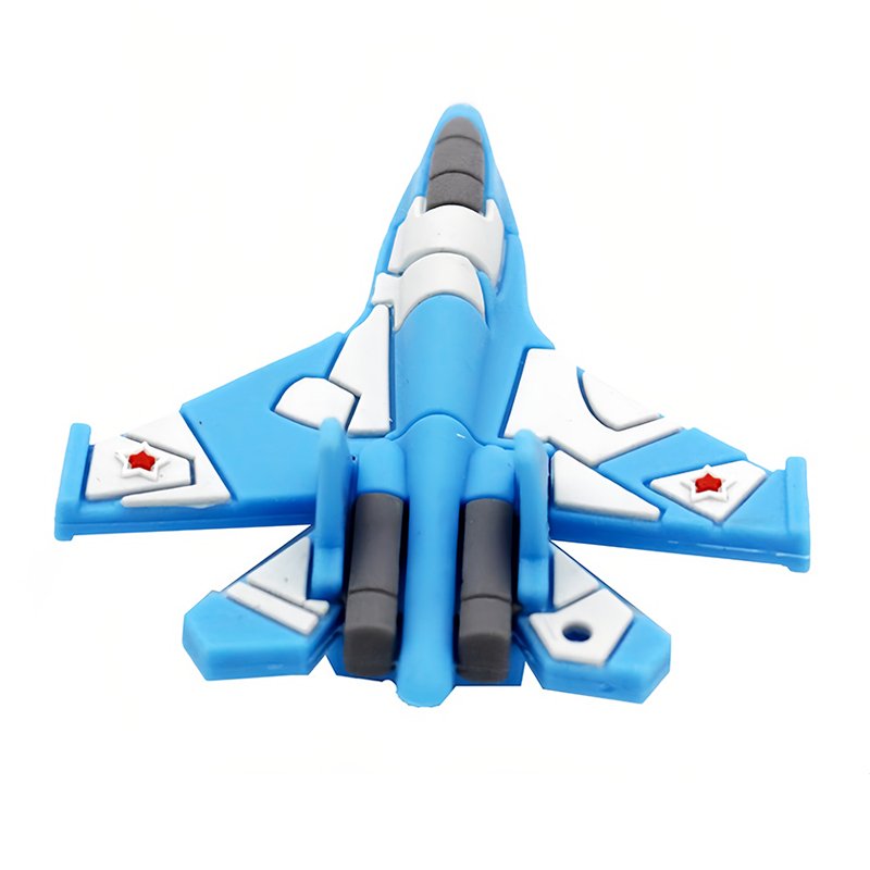 A creative USB drive modeled after sleek fighter jets, Available in blue, green, and black to capture the fighter jet aesthetic, crafted from flexible, durable, eco-friendly soft rubber.