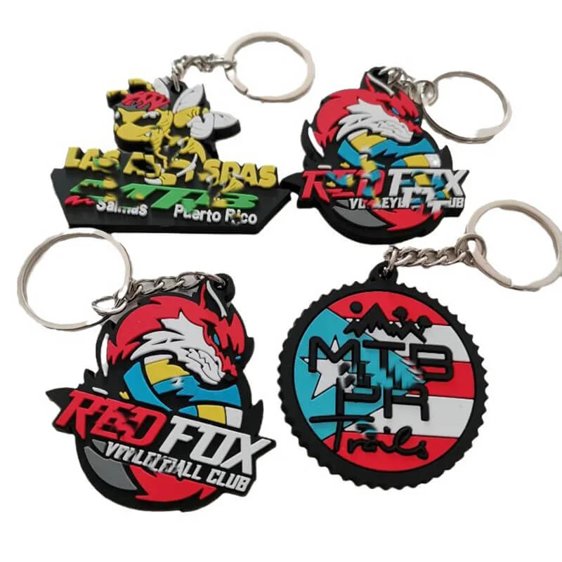 Los llaveros de dibujos animados de material PVC se dividen en dos tipos: llaveros planos simples y llaveros de figuras tridimensionales de dibujos animados. El pedido mínimo es de 100 unidades por diseño, y se puede personalizar el logo y la forma.