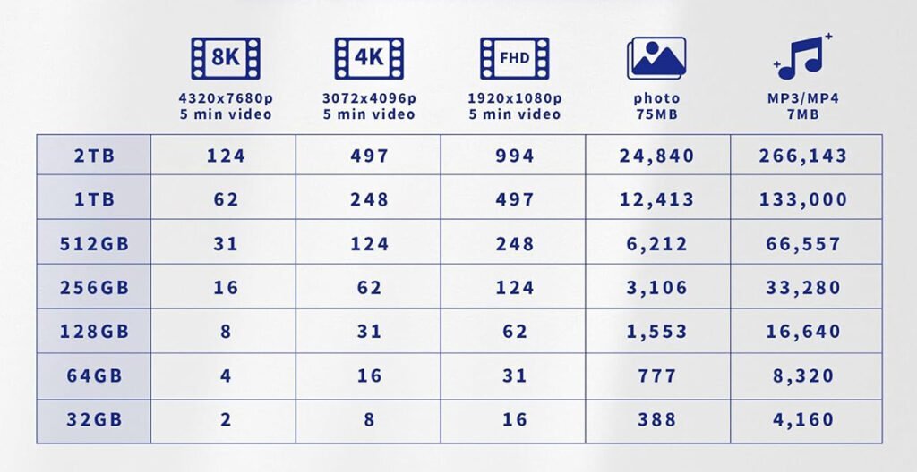 - 512GB: Approaching the capacity of a compact portable hard drive, this option suits users requiring extra storage “buffer.” It easily handles massive RAW photo collections (approx. 20-50MB per photo), multiple 4K HD videos, and complete backups of all mobile/tablet data (including apps, caches, and files) without frequent cleanup.